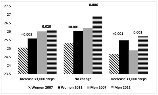 Increasing daily steps during middle age is associated with maintaining BMI at the same level. In this study, it was found that increasing daily steps to 2000 steps was associated maintain BMI at the same level as four years before. Since individuals’ metabolic rate declines with age, PA should be increased with age to maintain BMI at the same level as previously []. Maintaining PA at the same level as four years before was associated with an increase in BMI. Also, one of the issues emerging from this study is high stability of PA among men. Those who had low activity in 2007 were likely had low activity in 2011.
