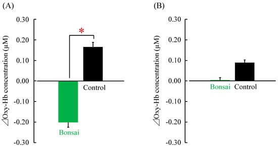 Mean oxy-Hb concentrations in the prefrontal cortices. (A) Changes in the left prefrontal cortex when viewing bonsai trees vs. control; (B) Changes in the right prefrontal cortex. N = 24, mean ± standard error. * p < 0.05, paired t-test. Δ, change.