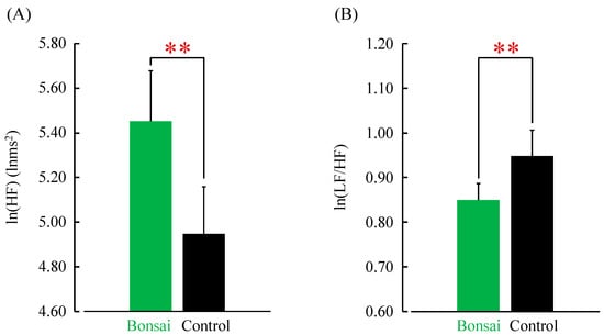 Autonomic nervous activity when viewing bonsai trees vs. control. (A) Parasympathetic nervous activity: mean natural logarithm (ln) of the high-frequency (HF) component; (B) Sympathetic nervous activity: mean natural logarithm (ln) of the ratio of low-frequency (LF) to HF (LF/HF). N = 24, mean ± standard error. ** p < 0.01, paired t-test.