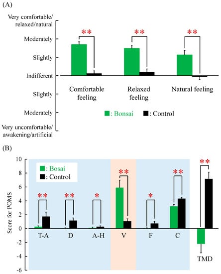 Questionnaire results. (A) Subjective feelings measured using the modified semantic differential method after viewing the bonsai trees vs. control. N = 24, mean ± standard error. ** p < 0.01, Wilcoxon signed-rank test; (B) Scores on the Profile of Mood States after viewing the bonsai trees vs. control. T-A, tension-anxiety; D, depression; A-H, anger-hostility; V, vigor; F, fatigue; C, confusion; and TMD, total mood disturbance. N = 19, mean ± standard error. * p < 0.05 and ** p < 0.01, Wilcoxon signed-rank test.
