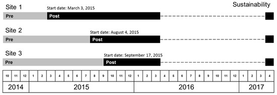 Although the three pilot sites originally were expected to implement SPARC at the same time, the timeline was renegotiated due to health system reorganization and leadership transitions, resulting in three separate start dates (Site 1: 3 March 2015; Site 2: 4 August 2015; and Site 3: 17 September 2015). These negotiated start dates were used in the quantitative analyses (described below) as the “official” start dates of the SPARC implementation at each site (see Figure 1). Prior to the implementation start date, each pilot site participated in a 3-day design event to develop, pilot, and refine the workflow for the SPARC trial. The design events occurred within a week before the official start dates at all three pilot sites.