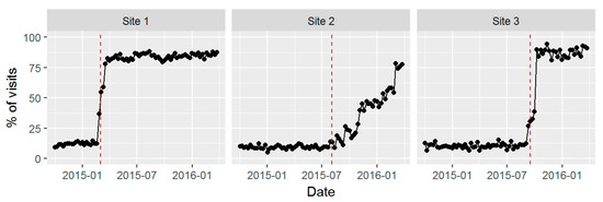 We conducted time series analyses using week intervals for screening and month intervals for assessment, diagnosis, and treatment. Specifically, we constructed visit-based binary indicators of each outcome and calculated the proportion of all PC visits to BHI providers during an interval (week or month), in which the patient (1) was screened for unhealthy alcohol use, (2) needed an AUD assessment and was assessed, (3) had a new AUD diagnosis, or (4) had a new AUD diagnosis and was treated. These proportions were plotted over the study period, separately for each clinic.