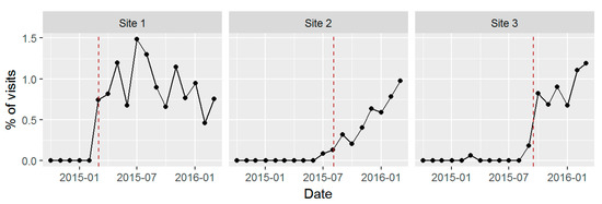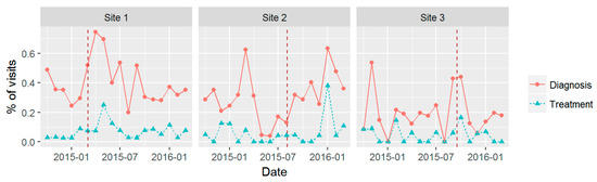 There was not a clear pattern in the time series of the number of patients with visits to BHI providers with a new AUD diagnosis or who were treated for AUD within the following 14 days (Figure 4). Across all sites, the number of patients with a new AUD diagnosis at their first visit during the period increased from 39 per 10,000 patients in the pre-implementation period to 58 per 10,000 in the post-implementation period (p = 0.0002; Table 3). This increase was driven by Site 1, where the number of patients newly diagnosed increased from 42 to 75 per 10,000 (p = 0.0003); in the other two sites, there was no difference in the number of patients per 10,000 with a new diagnosis (from 44 to 42 in Site 2 (p = 0.79) and from 28 to 30 in Site 3 (p = 0.85)).