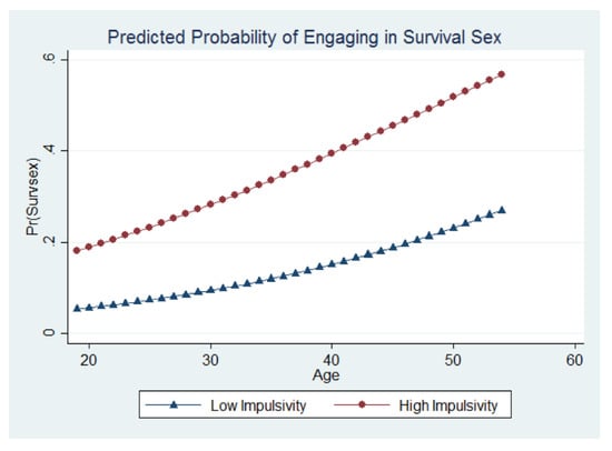 Figure 1 presents the predicted probabilities of engaging in survival sex as a function of age and impulsivity, as these are the only significant predictors after controlling for other symptoms of BPD, education, race, and years homeless. Figure 1 shows that the older a woman is, the probability of engaging in survival sex became higher. Furthermore, high impulsivity increased the probability of engaging in survival sex. The average participant in our study was approximately 38 years old. Comparing the experiences of those at the average age across the two predicted probability groups (low impulsivity and high impulsivity) showed that at 38 years old, the predicted probability for a female that had a low count of impulsivity was approximately 0.15. For women of the same age but with a high level of impulsivity, the predicted probability increased to just under 0.40. The predicted probability of engaging in survival sex for a woman of the average age (38) with high counts of impulsivity compared to low counts of impulsivity was more than double.