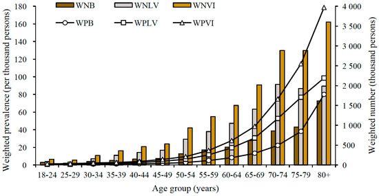 The estimated number and weighted prevalence of low vision, blindness, and visual impairment among Chinese adults, by age group. Note: WNB = weighted number of blindness; WNLV = weighted number of low vision; WNVI = weighted number of visual impairment; WPB = weighted prevalence of blindness; WPLV = weighted prevalence of low vision; WPVI = weighted prevalence of visual impairment.