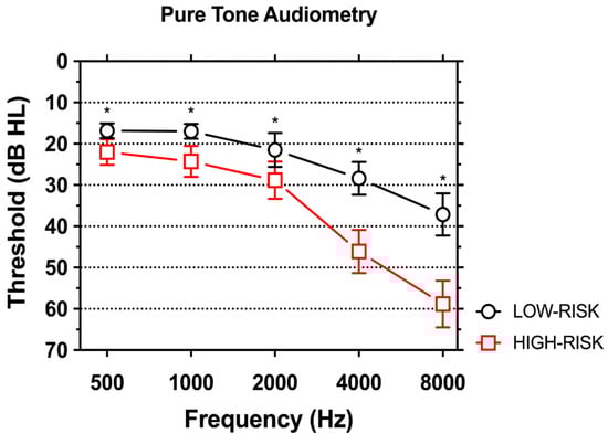 Pure tone audiometry in the LOW-RISK and HIGH-RISK groups. Means ±95 CI are shown. A statistically-significant worse auditory threshold was found for individuals in the HIGH-RISK group. Asterisks indicate statistically-significant differences. HL, hearing loss.