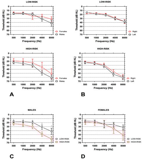 Pure tone audiogram (PTA) in the LOW-RISK and HIGH-RISK groups showing differences between males and females and side. Means ±95 CI are shown. (A) Worse hearing thresholds were found in males; however, the difference within the same group was not significant (p = 0.086). (B) No significant differences were found in hearing threshold between the right and the left ear although thresholds for high frequencies in the left ear were worse compared to the right ear (p = 0.64). (C) PTA for males; individuals in the HIGH-RISK group had a significantly worse hearing threshold than individuals in the LOW-RISK group (p < 0.001). (D) PTA for females; although worse hearing for high frequencies was found in patients in the HIGH-RISK group, the difference was not statistically significant (p = 0.12).