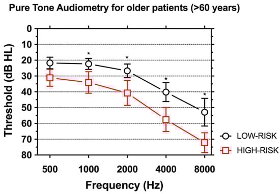 Comparison of pure tone audiometry thresholds in subjects older than 60 years in the LOW-RISK and HIGH-RISK groups. Significantly worse hearing was found in individuals in the HIGH-RISK group for all frequencies above 500 Hz (p < 0.001). Asterisks indicate statistically-significant differences.