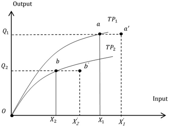To illustrate the technical efficiency, we draw the production frontiers of the facilities of two different operating scales in the market, TP1 and TP2 in Figure 1. Assuming there is no accreditation system or competition, organization 1 produces maximum output Q1 given input X1, and its average productivity is calculated as AP1 = OQ1/OX1. Similarly, for organization 2, given output Q2 and input X2, the average productivity is AP2 = OQ2/OX2. If government accreditation or competition is considered, to obtain good accreditation results, organizations might increase input resources to serve the same number of inpatients (output) under the inefficiency quality competition assumption. That is, input X1 increases to X’1 and X2 to X’2 and outputs remain at Q1 and Q2. Thus, excessive resource inputs exist: and . Technical efficiency equations of the two facilities can be derived as below.