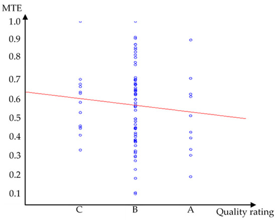 We observe that quality rating is positively related to input resources. For general care institutions, quality rated A (COH) and B (CQM) are both positively related to floor area (FLO). For nursing homes, A rated nursing homes are positively related to direct care personnel (DSP). However, for B rated nursing homes, quality rating does not show significant impact on input resources. It is also observed that the actual number of people accommodated (APE) is positively related to all three input resources (DSP, ISP and FLO). Increasing APE encourages institutions to devote more resources into operations. However, increasing input resources (DSP, ISP and FLO) has a negative impact on efficiency as shown in the metafrontier efficiency (MTE) column. Meanwhile, the quality rating is negatively related to MTE for general care facilities rated A and B, but positively related to nursing homes rated A. Figure 5 shows the regression line between MTE and the quality rating of all facilities, and a negative relationship between efficiency and quality rating can be clearly observed.