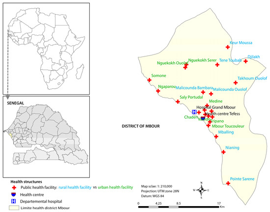 Map showing the study area and the location of the health facilities in the district of Mbour, Senegal.