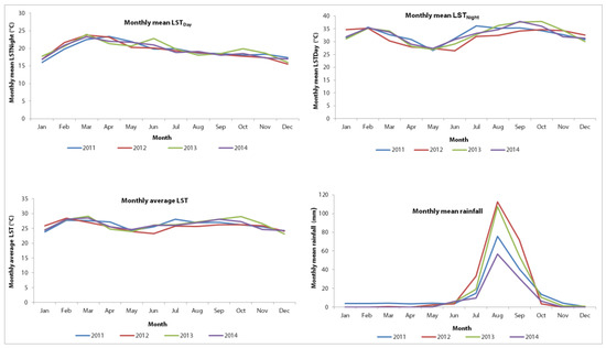 Distribution of mean monthly climatic variables in Mbour, Senegal over a four-year period from January 2011 to December 2014. Upper row: Distribution of mean monthly land surface temperature (LSTDay) and Night (LSTNight), by month and year, over the period 2011–2014. Lower row: Distribution of monthly average land surface temperature and monthly mean cumulative rainfall, by month and year, over the period 2011–2014.