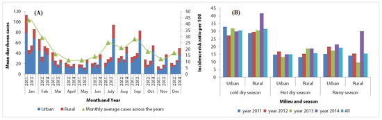 Table 4 and Figure 4 show that the numbers of diarrhoeal cases in rural settings were approximately five times lower than in urban settings (3895 vs. 19,648 cases). In 2014, an increase in the number of diarrhoeal cases was observed in the rural settings, both in the cold and rainy seasons, while this increase was only seen in the rainy season in the urban settings (Figure 4B). The overall incidence rate in both areas combined showed a significant difference by season (p < 0.001), age (p < 0.024) and sex (p < 0.001). Moreover, we observed a positive time trend in diarrhoeal cases.