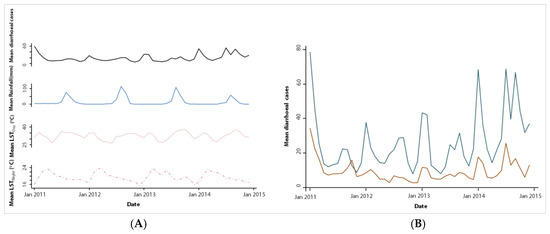 Trend in mean monthly mean diarrhoeal cases per health facility and climatic factors in the health district of Mbour over a four-year period from 2011 to 2014. (A) Trend in monthly mean diarrhoeal cases per health facility with mean rainfall, mean LSTDay and LSTNight; (B) Trend in mean monthly diarrhoeal cases per health facility in urban and rural settings.