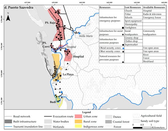 (a) Study town of Mehuín; (b) Study town of Queule; (c) Study town of La Barra; (d) Study town of Puerto Saavedra. Note: These maps show the urban, rural and indigenous areas of each study town, and indicate official security zones and evacuation routes. In addition, the available and lost resources after tsunami are mapped considering their location below and above the tsunami inundation line [26]. Sources: Civil Protection Plan in case of Tsunami 2013, Land Use Plans of Saavedra 2013 and Toltén 2012, and fieldwork on site.