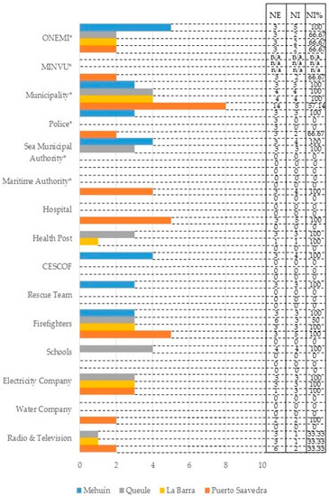 Percentage of people interviewed from each emergency institution. Note: ONEMI stands for the National Emergency Office. MINVU stands for the Ministry of Housing and Urbanism. CESCOF stands for Family Health Center. NE stands for Expected number of interviews. NI stands for number of interviews undertaken. NI% stands for the percentage of number of interviews undertaken. The * indicates governmental institutions.