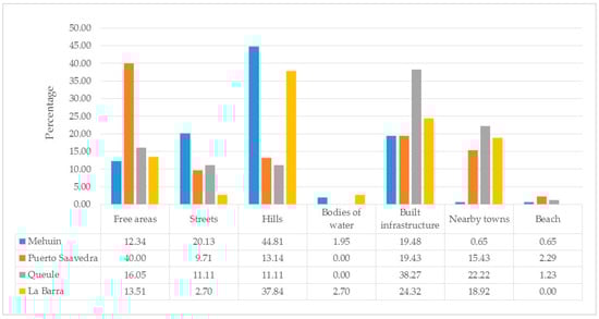 After the application of the Projective Mapping Technique, 29 sites were identified for Mehuín, 30 for Puerto Saavedra, 34 for Queule, and 16 for La Barra. These were classified into the following seven typologies using the content analysis approach: (1) “Free areas”, such as area for sports, open spaces, stadiums, coves, viewpoints, and safe areas; (2) “streets”; (3) “hills”; (4) “bodies of water” including rivers, estuaries, water springs, wetlands, and ravines; (5) “built infrastructure”, such as schools, hospitals, fire stations, gymnasiums, churches, radios, faucets, rafts and community venues; (6) “nearby towns”; (7) and “beach” (Figure 3). The most frequently mentioned site typologies were built types. These included “built infrastructure” in all cases (Mh = 19.48%, PS = 19.43%, Ql = 38.27%, LB = 24.32%) and “nearby towns” in most cases (PS = 15.43%, QL = 22.22%, LB = 18.92%). Also, “hills” were often frequently mentioned in Mehuín (44.81%) and La Barra (37.84%), and “free areas” were commonly mentioned in Puerto Saavedra (40%). On the contrary, the typologies less frequently mentioned were those belonging to natural environments. These included “bodies of water” (Mh = 1.95%, PS = 0%, Ql = 0%, LB = 2.7%) and the “beach” (Mh = 0.65%, PS = 2.29%, Ql = 1.23%, LB = 0%).
