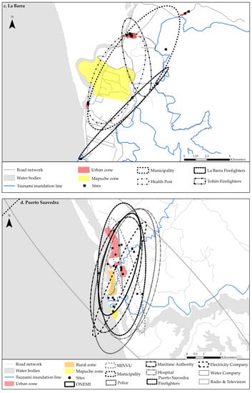In this study, there was a high degree of crossover of ellipses representing “evacuation” (Table 1 and Figure 8). In Mehuín, evacuation is facilitated by the Municipality, the Police, Firefighters and by the Sea Municipal Authority. In Queule, the crossover of the Municipality, Sea Municipal Authority and two different firefighter department ellipses reflects high redundancy in evacuation. In La Barra, there are also two firefighter departments involved in evacuation. In Puerto Saavedra, the Municipality, the Police, Firefighters and the Maritime Authority provide “evacuation” support in the Hospital sector. Maritime Authority institutions, only found in Puerto Saavedra, are usually located in towns of higher communal hierarchies, such as Puerto Saavedra, which is the capital of the commune. The Maritime Authority has several other roles during a tsunami emergency such as that of reporting information, searching for missing persons, registering damage, and distributing supplies. These needs can also be provided by the Sea Municipal Authority, Municipality, Rescue Team, Health post, Firefighters, MINVU and Radio and Television services (Table 1). Thus, having the Sea Municipal Authority in town increments redundancy of governance, which, in turn, adds to the adaptive capacity of the town.