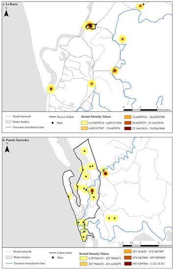 (a) Kernel Density Map: Mehuín; (b) Kernel Density Map: Queule; (c) Kernel Density Map: La Barra; (d) Kernel Density Map: Puerto Saavedra.