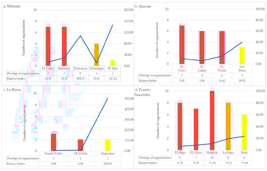In order to explain this finding, the Balance Index [31] was used to compare densities between centric and peripheral areas. This index is a measure of the balance between built and unbuilt areas; the lower the index, the more built areas. Built infrastructure includes not only emergency buildings but also public buildings, services, and housing. We have found considerably higher values of this index in the rural and indigenous sectors located in peripheral areas where unoccupied space is abundant (Figure 7). Furthermore, urban density is higher in the central parts of the towns due to more built space. Mississippi, located in Mehuín, is an exception to this finding because it is currently undergoing urbanization in order to become urban in the near future. Previous studies have found less overlap in governance in denser areas, and this has been explained by the lack of open space that can be used for the application of emergency procedures [22]. In this study, the variation in overlap in governance is also explained by the agglomeration of infrastructure (emergency infrastructure in particular) in centric and urban sectors.