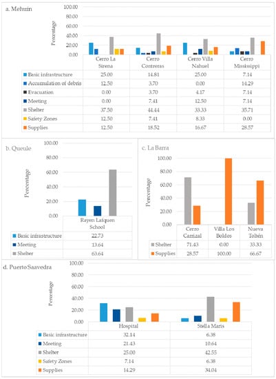The other towns had fewer sites with high intensity of use. In Queule, site index values ranged from 2.07 to a maximum of 529.23 (Figure 6b). The results indicated that there was only one site, the Rayen Lafquen School, with a high intensity of use. This site is classified as “built infrastructure”, and the site is predominantly used as “shelter” (63.64%), “basic infrastructure” (22.73%) and for “meetings” (13.64%). For La Barra the density values ranged from a minimum of 0.13 to a maximum of 33.92 (Figure 6c). Three sites had high intensities of use. These sites were classified as having “hill” (Cerro Carrizal) and “nearby towns” (Nueva Toltén and Villa Los Boldos) typologies. The uses assigned to these sites included “supplies” (Cerro Carrizal = 28.57%, Nueva Toltén = 66.67% and Villa Los Boldos = 100%) and “shelter” (Cerro Carrizal = 71.43%, Nueva Toltén = 33.33%). Finally, two sites, Stella Maris (“built infrastructure”) and the Hospital (“free area”) in Puerto Saavedra were found to have high usage intensities (Figure 6d). These sites are 30 m.a.s.l and both have indoor and outdoor space useful for emergency procedures. The uses assigned to these sites were “shelter” (Stella Maris = 42.55%, Hospital = 25%), “supplies” (Stella Maris = 34.04%, Hospital = 14.29%), “meeting place” (Stella Maris = 10.64%, Hospital = 21.43%), “basic infrastructure” (Stella Maris = 6.38%, Hospital = 32.14%) and “safety zone” (Stella Maris = 6.38%; Hospital = 7.14%). The density values for Puerto Saavedra ranged from 4.39 to a maximum of 1121.31.