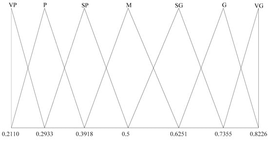 A LTS is called a balanced LTS if and the distribution of its semantic information is uniform and symmetrical; otherwise, is an unbalanced LTS. For example, an LTS including seven linguistic terms () is expressed as: