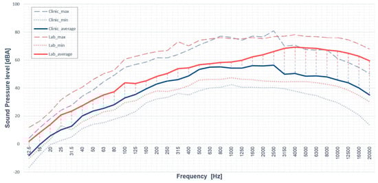A plot of the maximum, minimum, and average A-weighted sound pressure level of the noise at the dental clinic and the dental laboratory in 1/3-octave band spectrum.