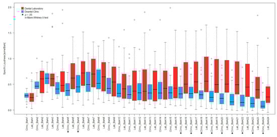 A combining boxplot of the averaged specific loudness changes of the noise at the dental clinic and the dental laboratory in 24-Bark band spectrum.