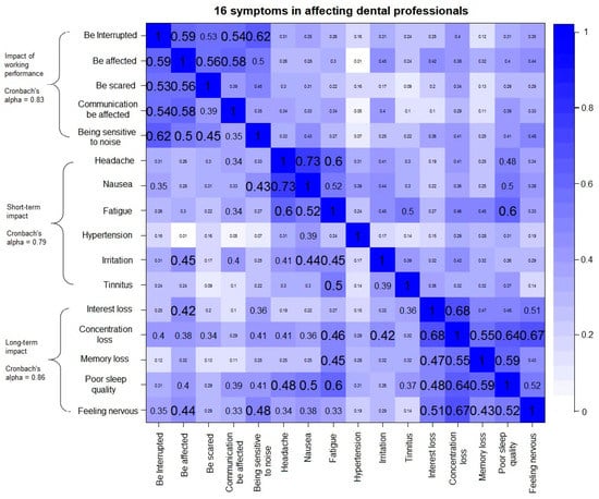 The Cronbach’s alpha reliability coefficient indicated the internal consistency of the items. Cronbach’s alpha lager than 0.8, 0.7, and 0.6, corresponded to a good, acceptable, and questionable internal consistency of the items. The values of Cronbach’s alpha of the variables “equipment noise influence”, “background noise influence”, “impact of working performance”, “short-term impact”, and “long-term impact” were 0.86, 0.66, 0.83, 0.79, and 0.86, respectively. The high values of Cronbach’s alpha explained the reliability of the questionnaire with the consistent measurement of the concepts except the variable “background noise influence”. It also provided the evidence of using the summated scores of the items for the latent variables in the further statistical analyses. For the variable “background noise influence”, the inconsistency between the items “human voices” and “phones”, and the items “air-conditioning system”, “computers”, and “broadcasting” about the machine noise reduced the value of Cronbach’s alpha. For simplifying the further statistical analyses, all of the five items were still kept in one variable instead of being divided into different variables like background noise from human and background noise from machines. The correlations between the 16 symptoms in affecting the dental professionals were shown in Figure 3. The bluer off-diagonal box illustrated the stronger positive correlation between the corresponding variables of the row and the column. The correlation coefficients were also labeled in the plot.