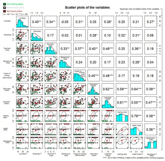 The correlations between the variables in the study were first analysed by the bivariate correlation tests. All of the results of the tests were presented in the summarised plot (see Figure 4). The diagonal components of the summarised plot were the distributions of the variables. The lower panel and the upper panel of the summarised plot were the scatter plots and the correlation coefficients of the corresponding row and column variables. If the significant results were obtained in the tests, the superscript “***”, “**”, or “*” would be added next to the correlation coefficients referring to the cases of p < 0.001, p < 0.01, or p < 0.05, respectively. The green, grey, and red color points in the plots represented the dental professionals who had a good, medium, or bad state of hearing. The correlation ellipses and best fitting locally weighted scatterplot smoothing were also drawn in the plots. The differences between the variables loudness and sharpness at the working locations were explained in the noise exposure assessment results. Also, a number of the significant correlations were found between the sound quality of noise and the dental professionals’ health condition (p < 0.05). For example, sharpness of the noise was found to be correlated with the negative short-term impact on the dental professionals, and their state of hearing and health. The environmental changes such as the changes of working location, loudness of noise, sharpness of noise, and the influences from the difference noise sources, were associated with the degree of impacts on the dental professionals. Moreover, the impacts on the dental professionals would affect the dental professionals’ health condition in their self-reported sate of satisfaction, hearing, and health. The further multiple regressions between the variables hence were needed to clarify the associations between the variables.