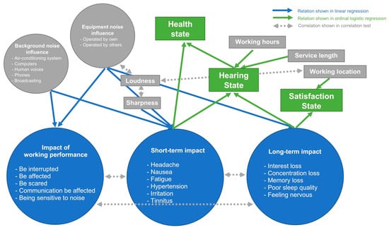 The health risk assessment of the study focused on measuring the health condition of the dental professionals from their state of satisfaction, hearing, and health. The application of the statistical analyses then provided the better understanding of how the health condition of the dental professionals was affected from the environmental changes and their impacts. The final health risk model (see Figure 5) was established from the results of the statistical analyses. The double-headed arrows in the figure represented the results of the significant correlations between the variables. If a causal relationship between variables is proved by a regression analysis, a direction of the arrow in the figure will be changed to single-headed. The variables from the direct measurement were drawn in the shape of rectangle, while the latent variables from the measurements of a list of variables were shown in the shape of circle. The results of the Cronbach’s alpha reliability tests revealed the reliability of the approach in the questionnaire to assess the degree of the noise influences and the negative impacts on the dental professionals. Firstly, the correlations between the variables loudness, sharpness, equipment noise influence, and working location were well explained in the results of the noise assessment. Secondly, the noise influences from both dental equipment, building facilities, and human voices would have the direct negative impact of working performance on the dental professionals. The greater impact of working performance on the dental professionals would then be shown up in the prevalence of the symptoms of the work be interrupted and be affected, be scared, the communication be affected, and being sensitive to noise. Thirdly, the short-term impact on the dental professionals was affected by not only the dental noise, influences, but also the sharpness of noise. The prevalence of the symptoms of headache, nausea, fatigue, hypertension, irritation, and tinnitus was dependent on the energy content of the high frequency components of noise but not the overall energy content. It explained why the overall SPL change was not enough to account for the variation of the self-report parameters []. Fourthly, the noise influence from dental equipment was more dominant than that from building facilities and human voices in affecting the long-term impact on the dental professionals. The prevalence of the symptoms of interest loss, concentration loss, memory loss, poor sleep quality, and feeling nervous was then occurred to the dental professionals from their long-term exposure to the dental equipment noise. The dental professional’s dissatisfaction of the working environment would be eventually resulted from their long-term impact due to the dental equipment noise at their working location. Fifthly, both the negative short-term impact and long-term impacts on the dental professionals from their occupational noise exposure would increase their risk of having a bad hearing state. The risk would be further increased for those with the daily working hours of more than eight. The further increment of the risk would be found for those worked for more than 10 years with the daily working hours more than eight. Finally, the risk of having a bad health state was highly associated with the risk of having a bad hearing state. Besides, the risk of having a bad health state would be increased from the dental professionals’ prevalence of the negative symptoms of headache, nausea, fatigue, hypertension, irritation, and tinnitus from their exposure to the high frequency noise. The study results showed the consideration of both objective and subjective data in the statistical analyses provided a more comprehensive understanding of the effects of noise on the dental professionals from sound properties of noise, to their perceptual influences, and finally to their health conditions. The objective data compensated the weakness of subjective data in assessing the acoustical properties of noise, while the subjective data compensated the weakness of objective data in assessing the perceptual responses to noise.