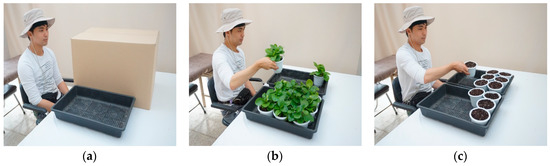 This study used a crossover experimental design, in which each experimental group crossed over from one treatment to another [35]. Figure 1a presents the resting position before each treatment. The treatment involved a task: transferring pots with foliage plants to a tray (Figure 1b); alternatively, the task after crossover was to transfer pots without foliage plants to a tray (Figure 1c). The foliage plants used for the transfer task were Peperomia obtusifolia. The plants have a general green color without any color variation on the leaves. The total weight of each pot, with or without a foliage plant, was approximately 500 g.