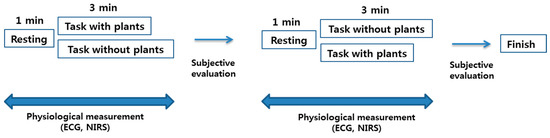 Each subject repeatedly performed the task with foliage plants for 3 min and then performed the same task without foliage plants for 3 min (Figure 2). Each subject transferred approximately 33 pots over a 3 min period with their self-controlled speed. The subjects randomly conducted the tasks with or without foliage plants. During the task, physiological parameters, including HRV and oxy-Hb concentration in the prefrontal cortex, were measured using portable electrocardiograph (ECG) and near-infrared spectroscopy (NIRS) devices, respectively.