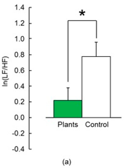 To assess autonomic nervous system activity, HRV was measured using a portable ECG (Activtracer AC-301A, GMS, Tokyo, Japan) during the task with and without foliage plants. The ratio of low-frequency (LF) to high-frequency (HF) (LF/HF) components is a measure of sympathetic nervous system activity as one parameter of HRV [36,37]. Frequency spectra were generated using HRV software (MemCalc/Win; GMS, Tokyo, Japan). LF (0.04–0.15 Hz) and HF (0.15–0.40 Hz) were calculated. To normalize HRV parameters, natural logarithmic (i.e., ln) transformed values were used [38].