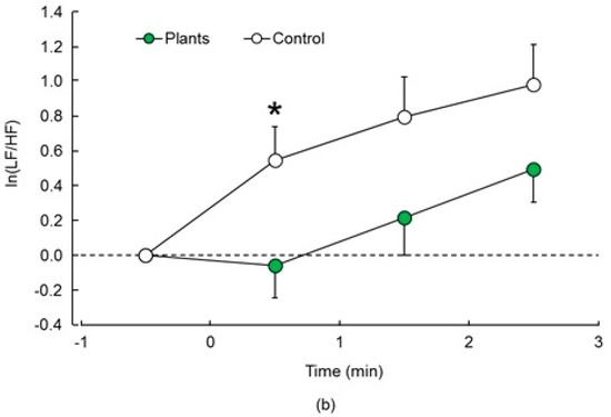 Values of ln(LF/HF), which estimate sympathetic nerve activity, were significantly lower in the task performed with foliage plants compared to the task without foliage plants (Figure 3a) at p < 0.05 by paired t test. In the time-series data, a significant difference between the two treatments emerged after the first minute (Figure 3b). Meanwhile, there was significant difference in the 0–1 min (p = 0.010, p < 0.05 by Holm correction), 1–2 min (p = 0.040, p > 0.05 by Holm correction), and 2–3 min (p = 0.047, p > 0.05 by Holm correction) interval.
