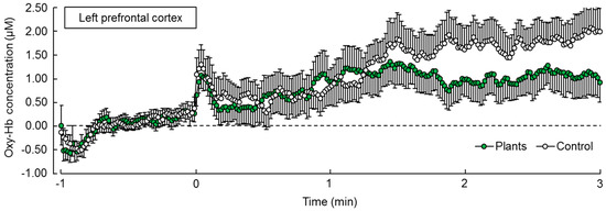 Oxy-Hb concentration in the left prefrontal cortex showed a decreased tendency in the task with foliage plants compared to without plants in the 2–3 min interval, although there was no statistically significant difference in the measured data for 3 min at p < 0.05 by paired t test (Figure 4). Meanwhile, oxy-Hb concentration in the left prefrontal cortex in the 2–3 min interval tended to decrease (p = 0.030, p < 0.10 by Holm correction). However, there was no statistically significant difference in the 0–1 min (p = 0.202) and 1–2 min (p = 0.415) intervals of the oxy-Hb concentration in the left prefrontal cortex. On the other hand, oxy-Hb concentration in the right prefrontal cortex was not changed during either task.