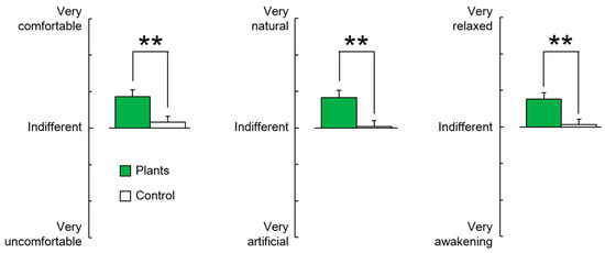 Comparisons of a modified semantic differential (SD) method under conditions of a task with foliage plants versus a task with no foliage plants. Data presented as mean ± standard error (N = 24). ** p < 0.01 as determined by the Wilcoxon signed-rank test.