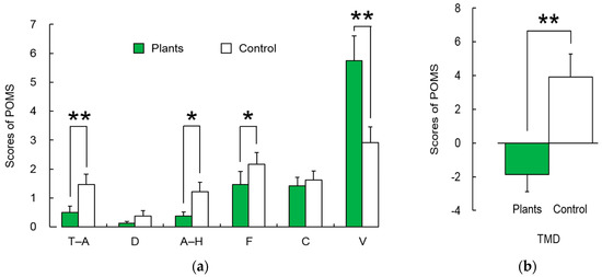 (a) Comparisons of tension-anxiety (T-A), depression-dejection (D), anger-hostility (A-H), fatigue (F), confusion (C), and vigor (V) in the profile of mood state (POMS) questionnaire between tasks involving foliage plants and tasks with no foliage plants; (b) Comparisons of the total mood disturbance (TMD) score in the profile of mood state (POMS) questionnaire between conditions. Data presented as mean ± standard error (N = 24). ** p < 0.01; * p < 0.05 as determined by the Wilcoxon signed-rank test.