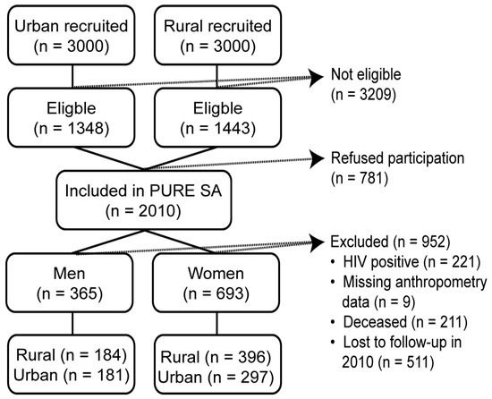 We further excluded 221 HIV-positive participants and nine others with missing anthropometric data. Hence, a total sample of 1058 (365 men and 693 women) with complete data at baseline and at five-year follow-up were eligible for our study’s data analyses. Those who remained in their respective areas of residence throughout the study period were included, whereas change in address to outside the study areas (rural to urban or vice versa) was regarded as loss to follow-up. The participants lost to follow-up were younger and had significantly lower BMI, but a similar mean WC to those who were followed up [35]. We speculate that the participants lost to follow-up due to relocation could be a result of employment opportunities elsewhere for younger individuals with higher educational status. The study was approved by the Health Research Ethics Committee of North-West University (NWU), Potchefstroom campus (04M10 and NWU-00016-10-A1), South Africa. All participants provided written informed consent. The PURE-SA study conformed to the Declaration of Helsinki as revised in 2004.