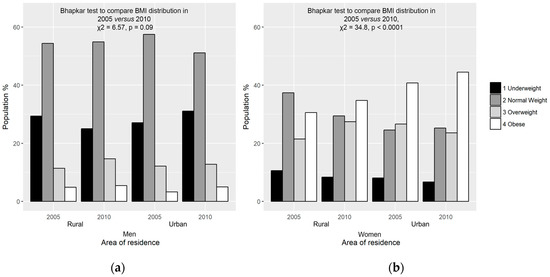 The Bhapkar tests for agreement between BMI subdivisions in 2005 and 2010 revealed that, although there was a trend to shift from underweight and normal weight to overweight and obese categories, the distribution among the categories at baseline and follow-up showed marginal homogeneity in the total group of men (χ2 = 6.57, p = 0.09). Less agreement was found in rural than among urban women. Almost three-quarters (74.6%) of rural and 79.5% of urban women were in the same BMI segment at both time points. Overall, there was a significant difference in distribution between the BMI categories of women in 2005 and 2010 (χ2 = 34.8, p < 0.0001), with a general shift from underweight and normal weight to overweight and obese categories (Figure 2b). Whereas most increases in BMI categories can be regarded as detrimental, moving from being underweight to normal weight is beneficial: a small group (5.48% men and 2.45% women) progressed from the underweight to normal weight BMI category.