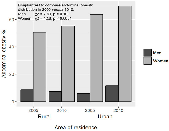 Abdominal obesity prevalence stratified by sex and residence at the two time points.
