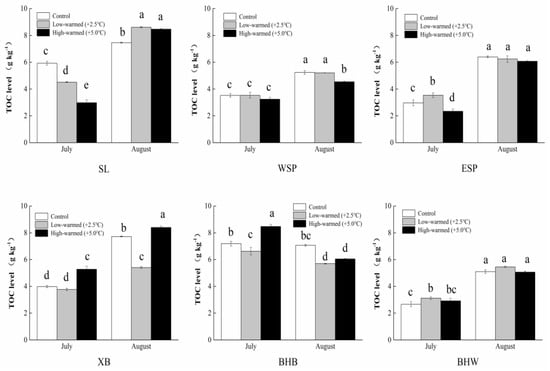 | TOC (g·kg−1) | 5.925 ± 0.141 b | 3.523 ± 0.131 c | 2.971 ± 0.215 d | 3.976 ± 0.083 c | 2.663 ± 0.18 d | 7.194 ± 0.172 a |