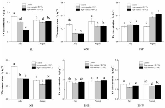 | TN (g·kg−1) | 2.602 ± 0.049 a | 0.265 ± 0.016 e | 0.233 ± 0.011 e | 0.506 ± 0.002 d | 0.768 ± 0.013 c | 1.786 ± 0.022 b |