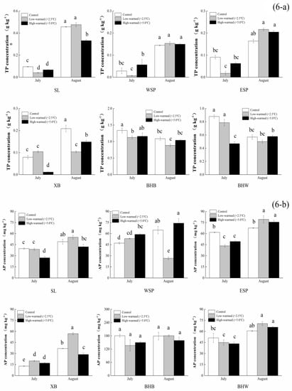 | TP (g·kg−1) | 0.095 ± 0.003 c | 0.029 ± 0.013 c | 0.091 ± 0.008 c | 0.079 ± 0.008 c | 0.879 ± 0.024 b | 1.337 ± 0.075 a |