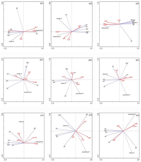 | NO3−N (mg·kg−1) | TN (g·kg−1) | TP (g·kg−1) | SUC (mg·g−1·24 h−1) | URE (mg·g−1·24 h−1) | CAT (mg·g−1·20 min−1) | TOC (g·kg−1) | AKP (mg·g−1·24 h−1) | AP (mg·kg−1) | pH | EC (μS·cm−1) | |
