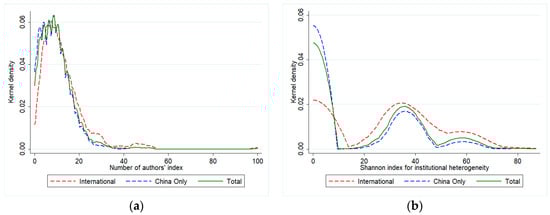 Distribution of index complexity indices for International and China-only publications: (a) Number of authors’ index, kernel estimates; (b) Shannon index for institutional heterogeneity, kernel estimates. Source: authors’ elaboration.