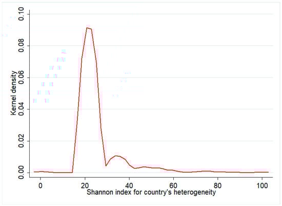 Shannon index for country’s heterogeneity for International publications, kernel estimate. Source: authors’ elaboration.