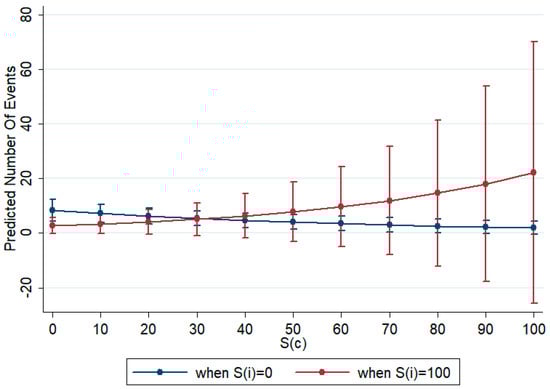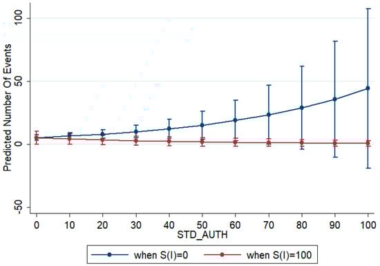 To understand whether the interactions between the complexity indices amplify or reduce quality, we graphically show their covariation by fixing them at specific values. In this case, we chose to analyze how indices covariate when complexity is at its minimum and its maximum. In Figure 6 and Figure 7 we show the variation in the number of citations (predicted number of events) related to the standardized number of authors (STD_AUTH) and to countries’ complexity (S(c)) when the institutional complexity, measured by S(i), takes the minimum (0) or the maximum (100) value. From the analysis of the two graphs, we can identify a large moderating effect of institutional complexity on the positive effect of number of citations and of the negative impact of country’s complexity on quality. In the first case (Figure 6), when institutional complexity is equal to 0, if the number of authors increases there is a positive impact on quality. However, if institutional complexity is at its maximum, to enlarge the network by increasing the number of authors has a depressive effect on quality. In the second case (Figure 7), if the research network is homogeneous in terms of institutions (S(i) = 0), to increase the number of countries induces a decrease in quality. When instead the institutional complexity is maximum, to have larger networks in terms of countries involved has a positive impact on quality.