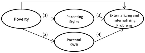 A large body of research has demonstrated that poverty, low income, and low socioeconomic status are linked to behavioral problems in children and adolescents [1,2,3,4]. However, the mechanisms that explain this association remain a major topic in this line of research. Many of the previous studies are guided by the Family Stress Model (FSM) [5,6] or the Family Investment Model (FIM) [7,8]. These models argue, respectively, that family financial difficulties, by negatively impacting emotional and relationship functioning, disrupt effective parenting practices, and the lack of economic resources requires parents to focus on immediate material needs, thus limiting the investment in developmentally supportive conditions for their offspring. Indeed, previous studies have suggested that parental mental health and parenting styles are important mechanisms underpinning the correlation between low income and poverty and child behavior problems. Low income and poverty were linked to inconsistent, unsupportive, and uninvolved parenting styles and poor parental mental health, which in turn are associated with child behavior problems.