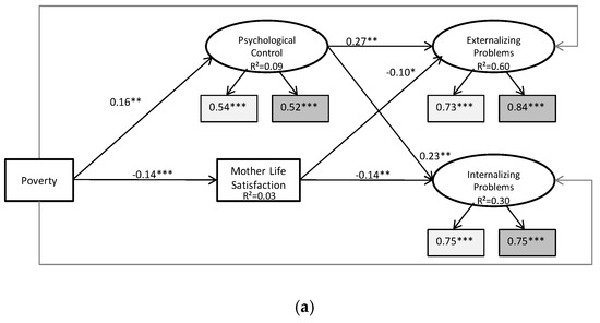 The results from the structural equation model (Figure 2a,b) show no significant direct effect of poverty on internalizing (β = 0.03, p = 0.509) and externalizing problems (β = 0.04, p = 0.429). However, this does not mean that poverty is not linked to child behavior problems: it is possible that the effect of poverty on child behavior problems is fully mediated, and this becomes evident in Figure 2a. We found significant direct effects of poverty on psychological control (β = 0.16, p < 0.01), inconsistent parenting (β = 0.12, p < 0.05), and mothers’ life satisfaction (β = −0.14, p < 0.001). Furthermore, psychological control (β = 0.23, p < 0.01) and mothers’ life satisfaction (β= –14, p < 0.01) have significant direct effects on internalizing problems. This is also true for externalizing problems (psychological control: β = 0.27, p < 0.01; mothers’ life satisfaction β = −0.10, p < 0.05). This suggests that full mediation may indeed occur.